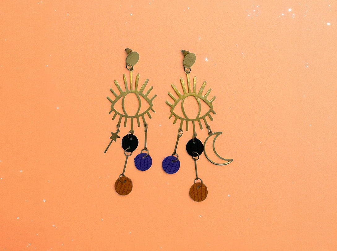 Ghoulish, fun, and oh-so-spooky, the Witching Hour statement earrings are an enchanted take on the season. These handcrafted beauties feature a whimsical mix of electric purple, orange, and black, accented with shimmering gold details for the perfect balance of fun and elegance. They’re the ultimate statement piece for those who love bold color and whimsical charm.
